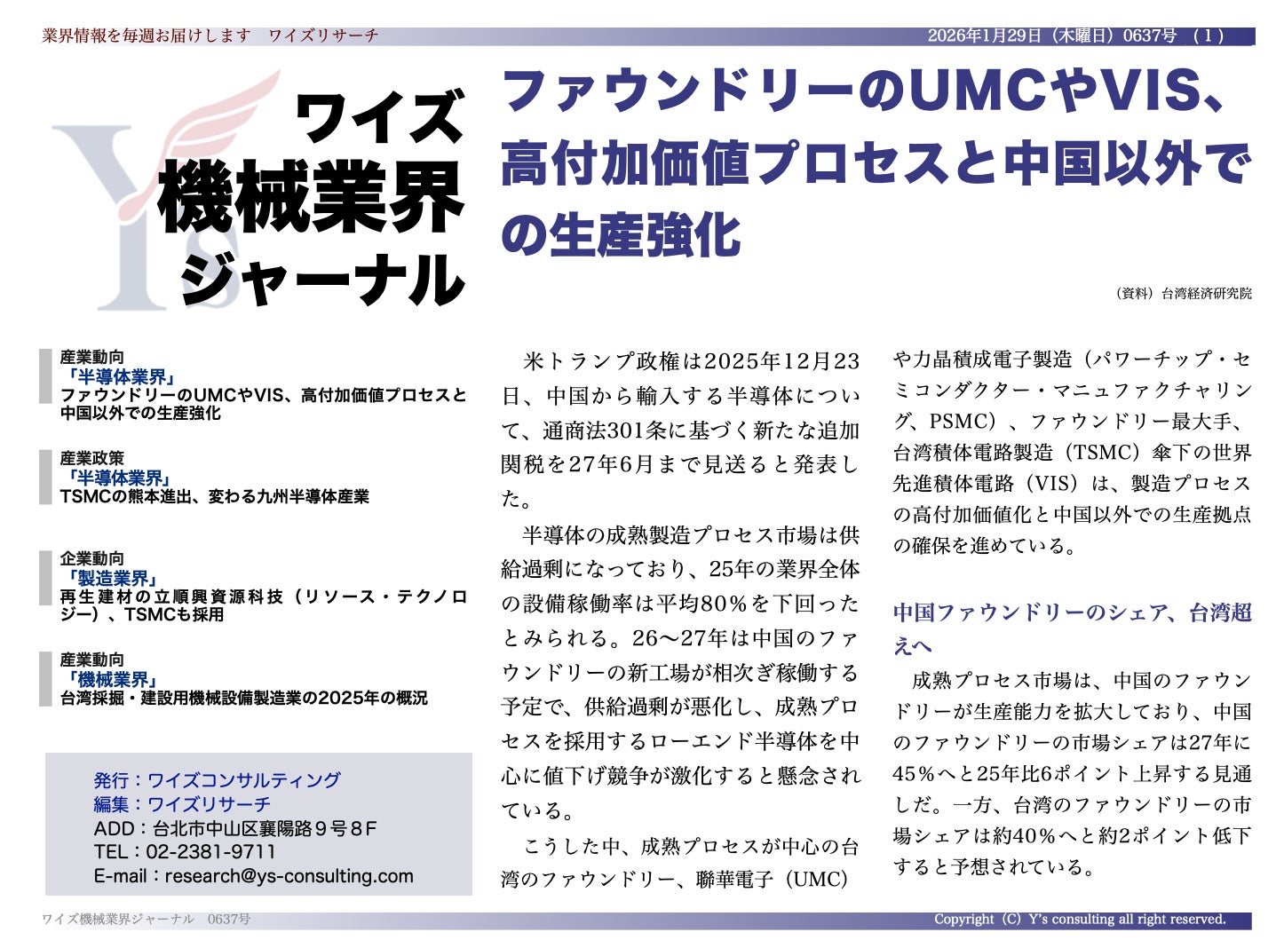 今号では、中国の安値攻勢に直面する半導体成熟プロセス市場の現況と、UMC(聯華電子)やVIS(世界先進)が進める高付加価値化・生産拠点の「脱中国」戦略を特集。米国の追加関税発動を見据えた、2027年までの業界再編の動きを分析しています。