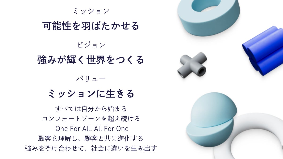 今回のMVVの刷新に伴い、コーポレートサイトをリニューアルしました。このリニューアルを通じて、ビジネス基盤をさらに強化し、企業ブランディングを一層高めることを目指しています。新たなコーポレートサイトでは、ビジョン「強みが輝く世界をつくる」をテーマに、個々が持つ無限の可能性や強みを、さまざまな3Dモチーフを用いて視覚的に表現しました。それぞれの強みが掛け合わさることで、新たな価値が生まれ、社会に変革をもたらす――私たちの描く未来がこのサイトに体現されています。