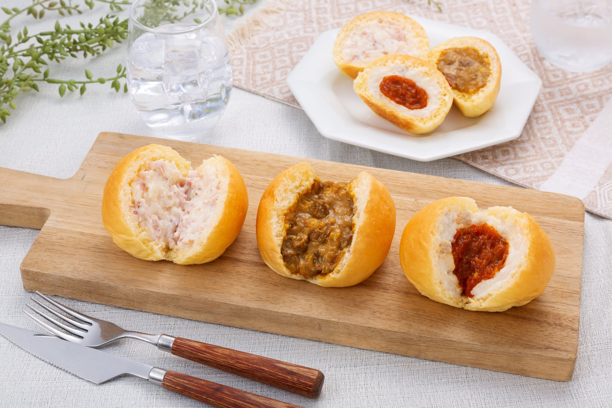 ワンハンドで楽しめるお食事パンシリーズ『ポケットサンド』より、「カレー」「チキングラタン」「ベーコンポテト」をご用意しました。
