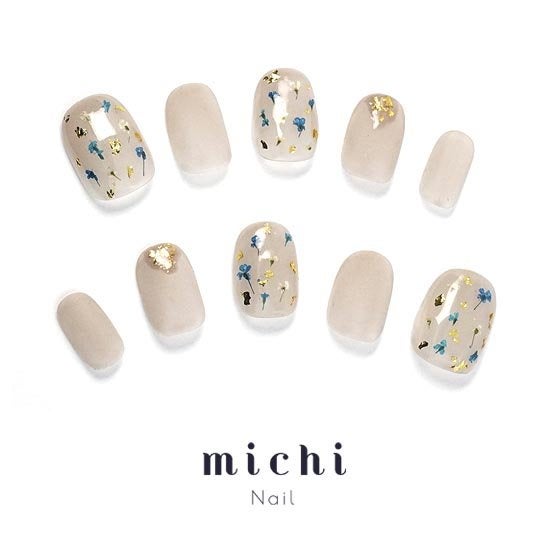 ナチュラルなベージュのベースカラーに小さなドライフラワーがたくさん飾られたボタニカルな雰囲気のネイル。肌なじみもよく、さりげない金箔で高級感もプラスされたデザインです。艶仕上げとマットのいいとこどりが叶ったおしゃれネイルです。