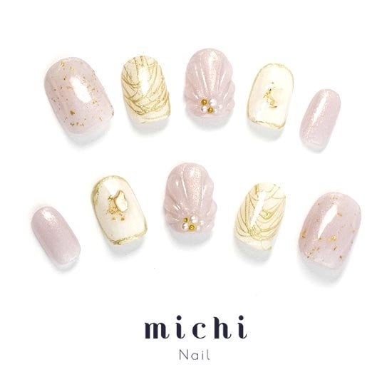 夏っぽさとプリンセス感のあるシェルネイル。ピンクとホワイトのベースのゴールドのアートで、王道可愛いデザインに仕上がっています。デートやパーティー、結婚式のお呼ばれなどワンピースやドレスに合わせたくなるキュートなネイルです。