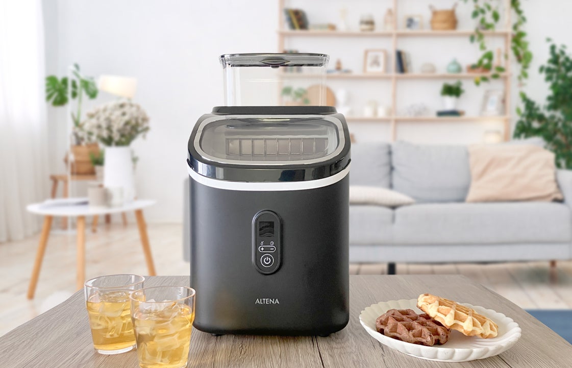 キッチンに「ALTENA クリアキューブ高速製氷機/ICE-CB01」を置くだけで、そこはもうプロのカフェさながらの空間に。お客様には見た目にも美しい透明氷を添えた一杯を、ご家族には「すぐできる」安心感を届けます。