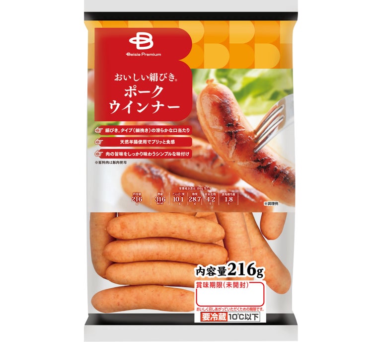 毎日の朝食やパスタ・焼きそばなどアレンジメニューでも活躍するポークウインナーです。絹びき®️タイプ(細挽き)の滑らかな口当たりで、焼いたときにプリっとした食感を味わえます。肉の旨味をしっかり味わうシンプルな味付けなので、どんなメニューにもよく合います。