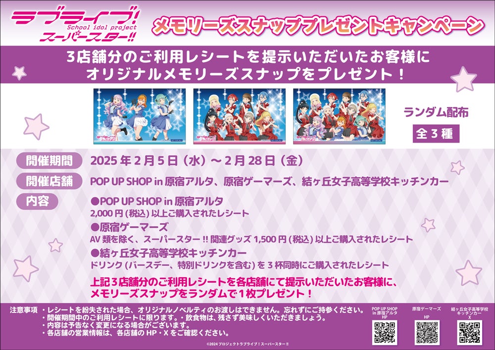 POP UP SHOP in 原宿アルタ・原宿ゲーマーズ・結ヶ丘女子高等学校キッチンカーの3店舗をご利用いただいた方に、オリジナルメモリーズスナップをランダムで1枚プレゼント!