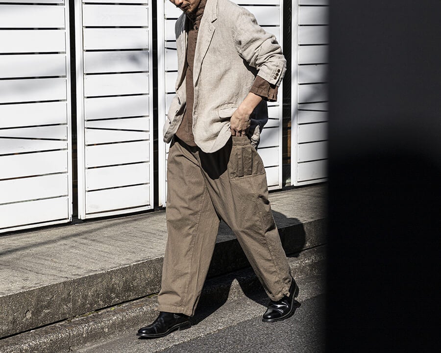 スタンダード、シンプル、トラッド、ミリタリー、ワーク、トラッド、クラシック、モダン…etc。メンズ服の普遍的な要素を根底におきながら、染め、洗いを駆使しながら独自のバランスで融合させた服作りをコンセプトにしています。