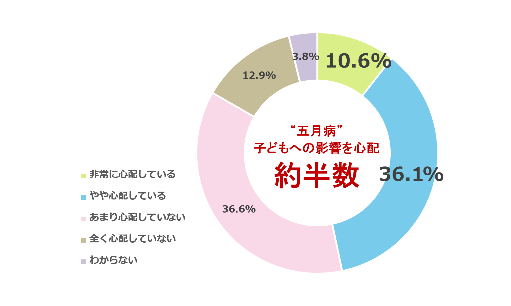 ゴールデンウィーク明けにおける子どもの学習意欲や生活リズムの乱れ(いわゆる“五月病”傾向)について心配しているか尋ねたところ、46.7%が「心配している」(非常に心配している:10.6%、やや心配している:36.1%)と回答しました。