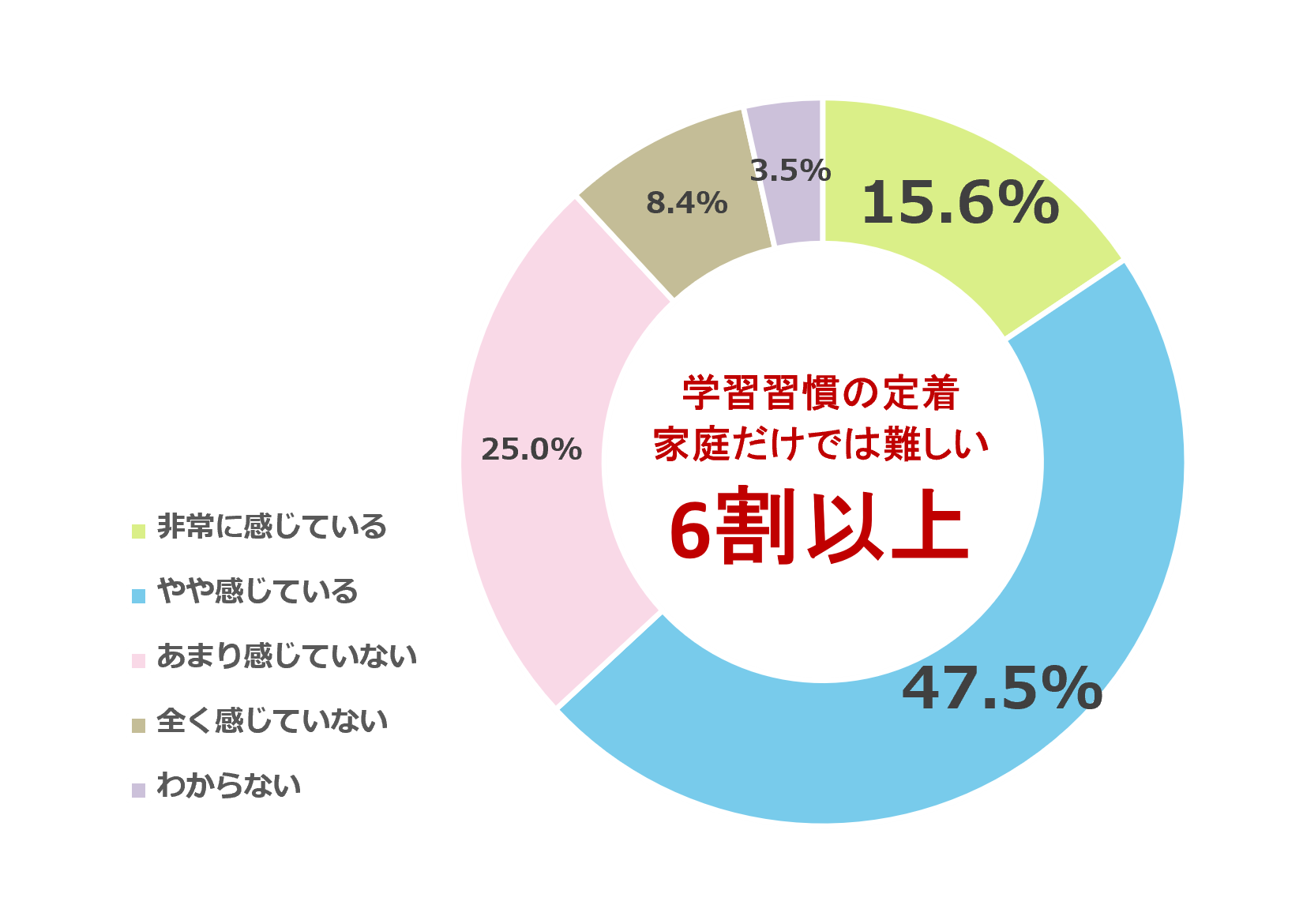 この結果から、子どもの学習習慣の定着は家庭内の努力だけでは対応しきれない課題として、多くの保護者に認識されている実態が明らかになりました。継続的な学習習慣をいかに築くかは、より幅広い視点からのアプローチが求められる問題として浮き彫りになっています。