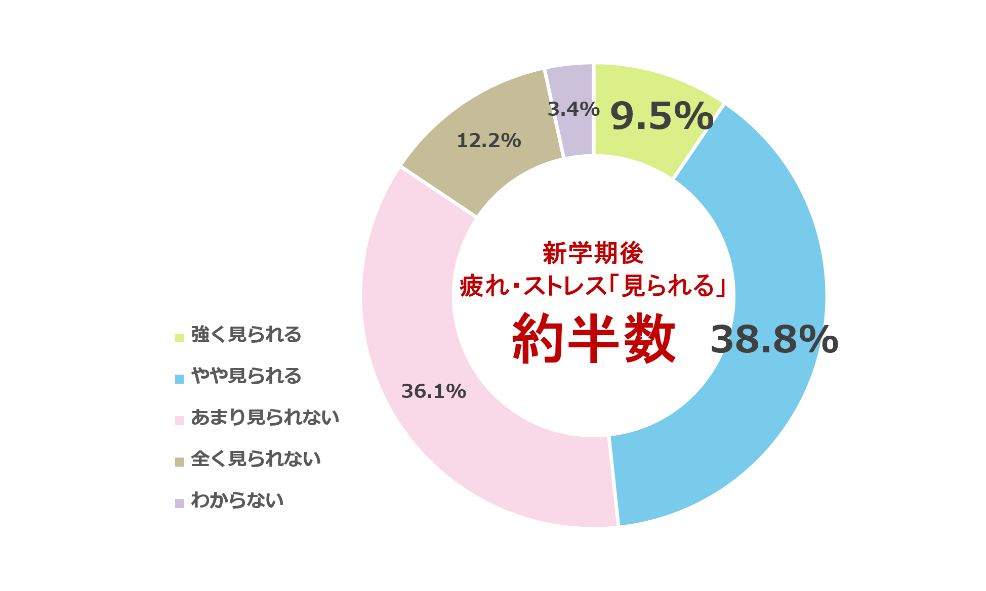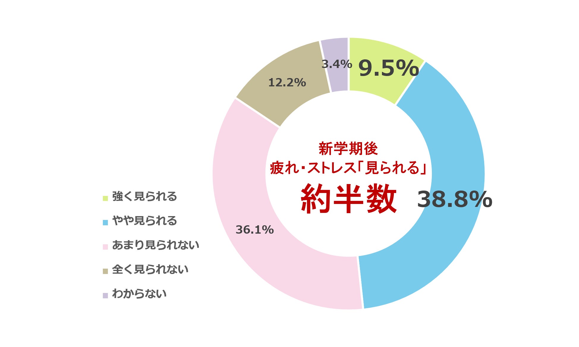 新学期が始まり約2週間が過ぎた時点で、子どもに疲れやストレスの様子が見られるか尋ねたところ、48.3%が「見られる」(強く見られる:9.5%、やや見られる:38.8%)と回答しました。