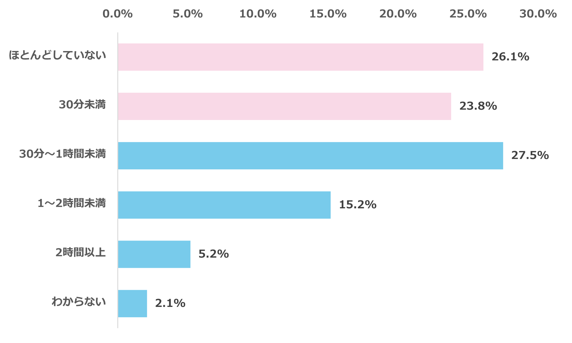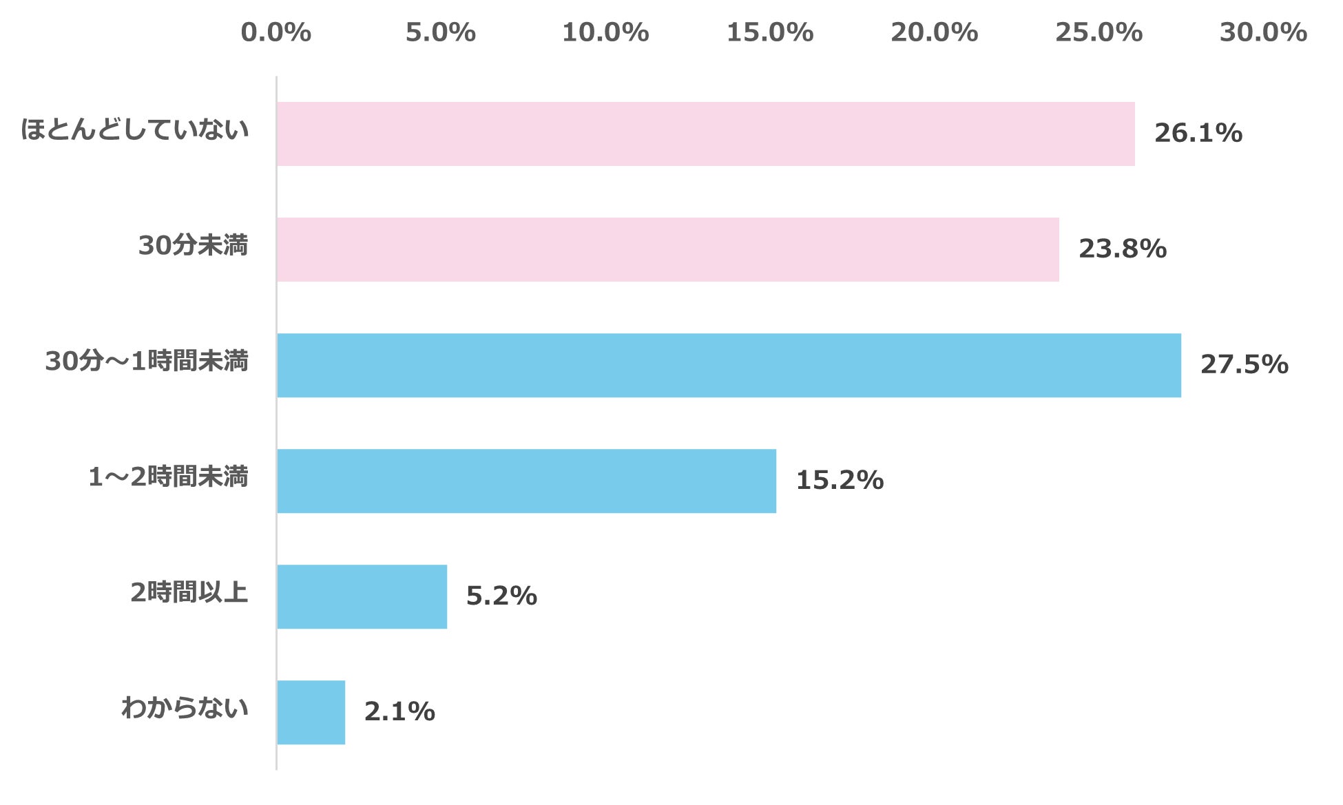 一方、「30分未満」(23.8%)と「ほとんどしていない」(26.1%)を合わせると約5割(49.9%)に上り、宿題以外の自主的な学習習慣が十分に定着していない実態が浮き彫りになりました。