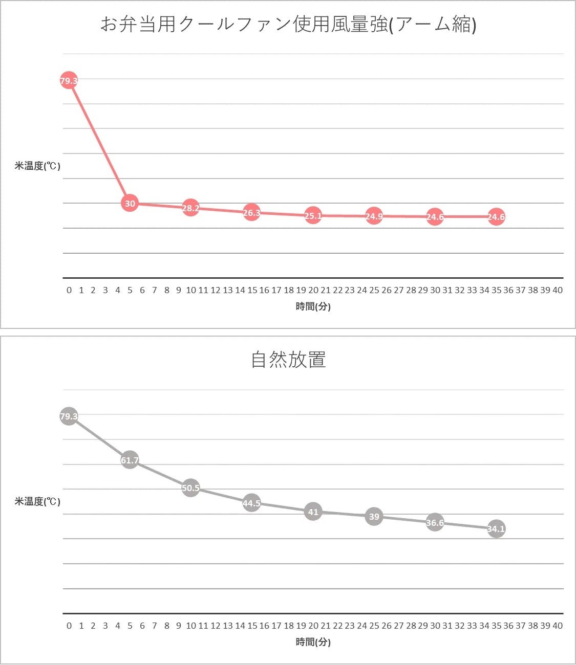 お弁当用クールファンを使用した場合、開始5分で一気に約30度まで粗熱を取ることが可能!