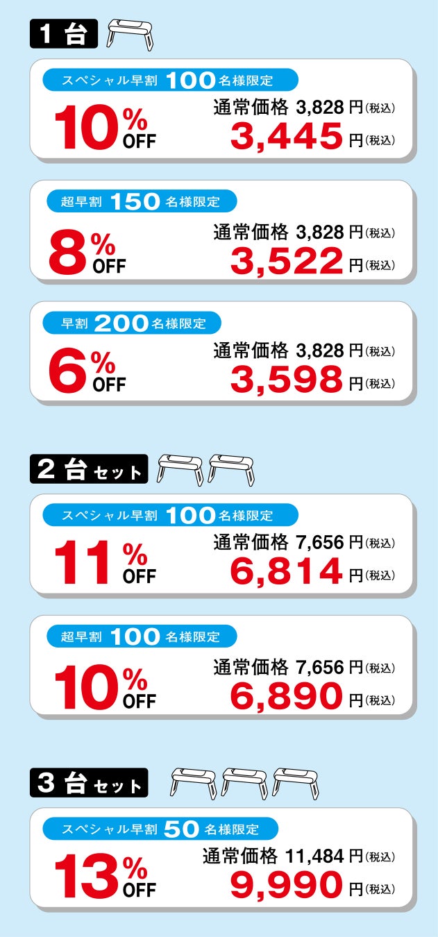 1番おトクな「スペシャル早割」は、3台セットで9,990円(税込)で購入可能!