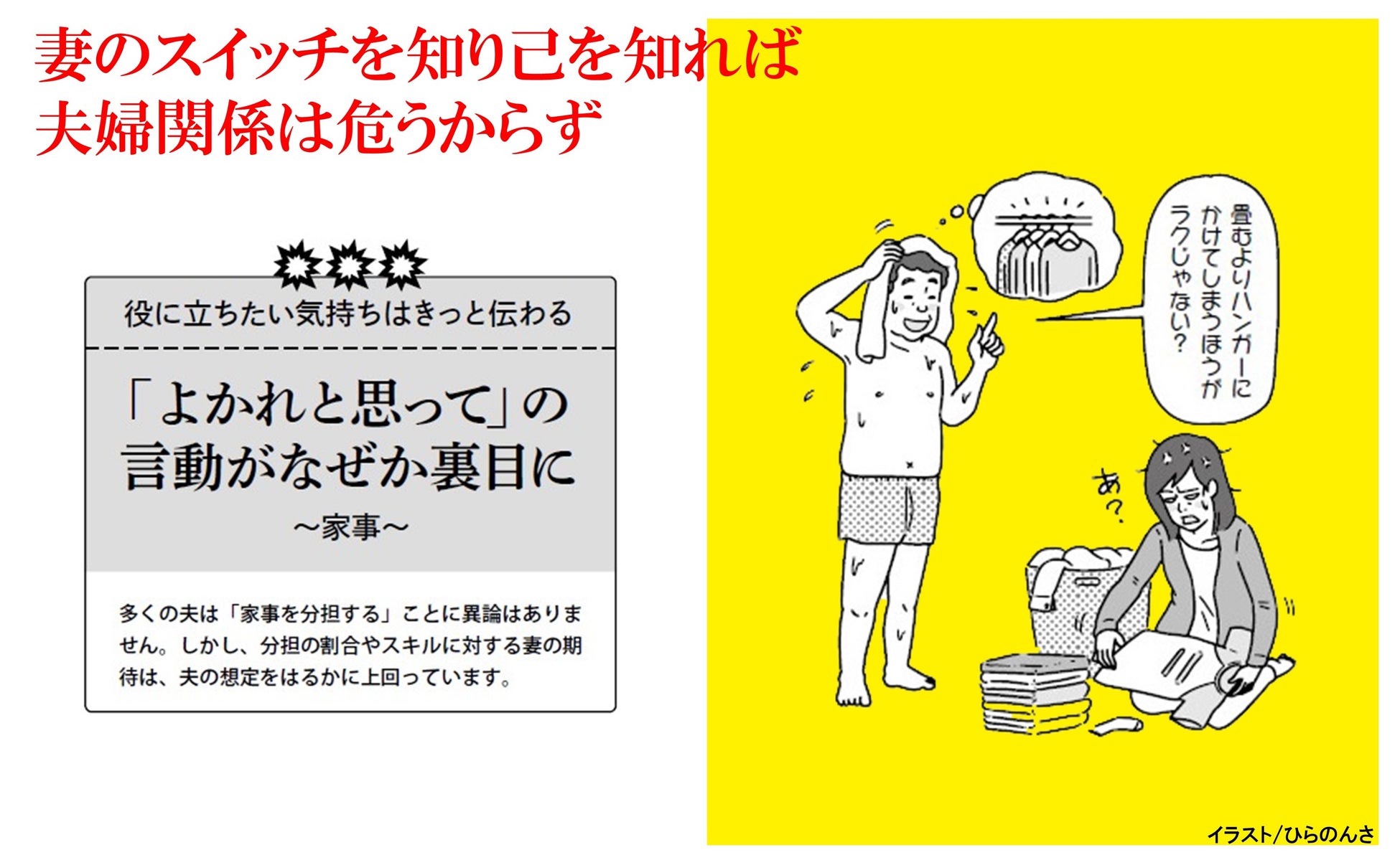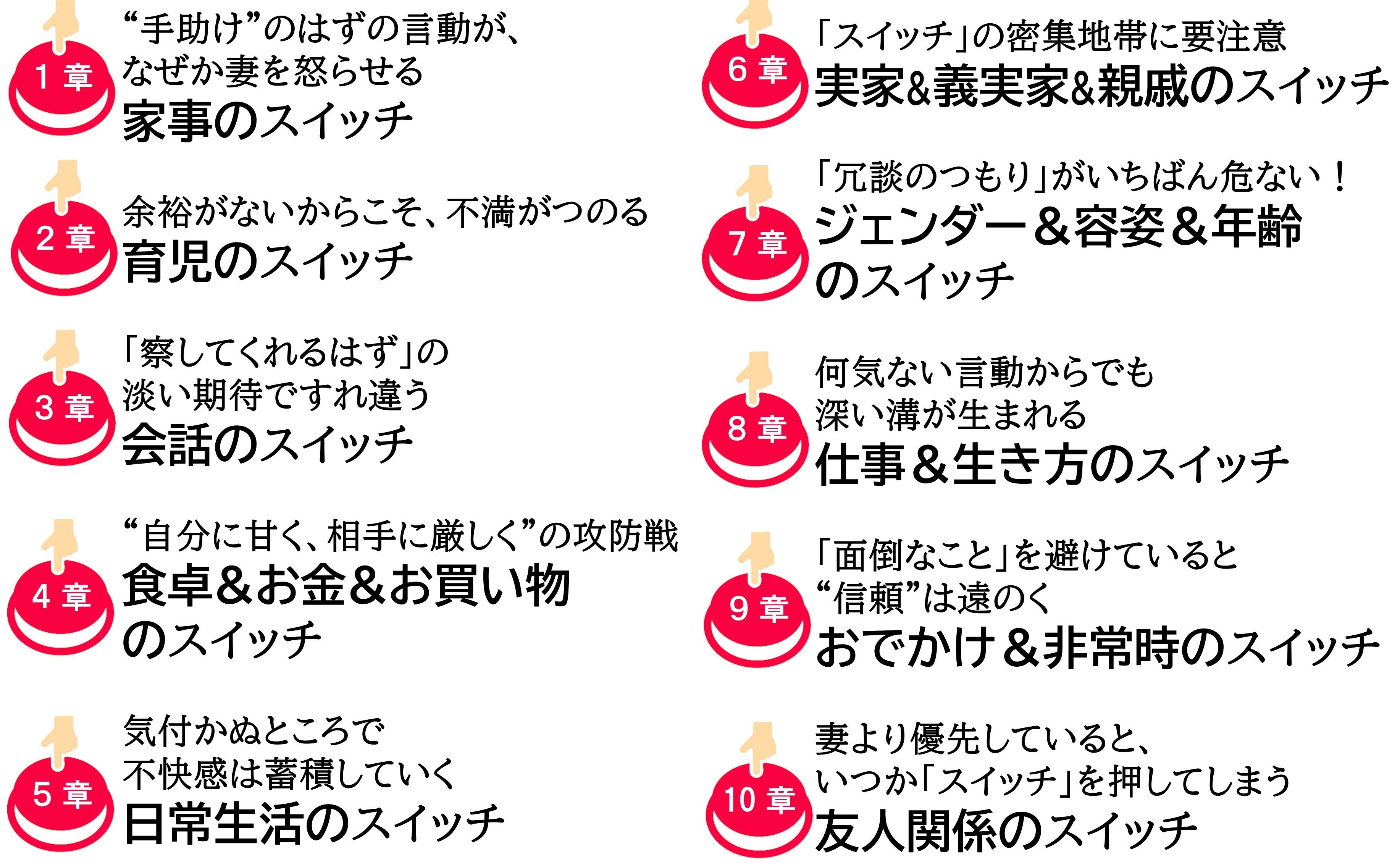 なぜ妻は急に不機嫌になるのか。あるいは、なぜいつもイライラしているのか。原因がわからず、悩む夫は多いのではないでしょうか。実はわれわれ夫は、自覚なしに不用意な言動をし、よかれと思って口にしたひと言によって、 「押してはいけない 妻のスイッチ」を押してしまっているのです。