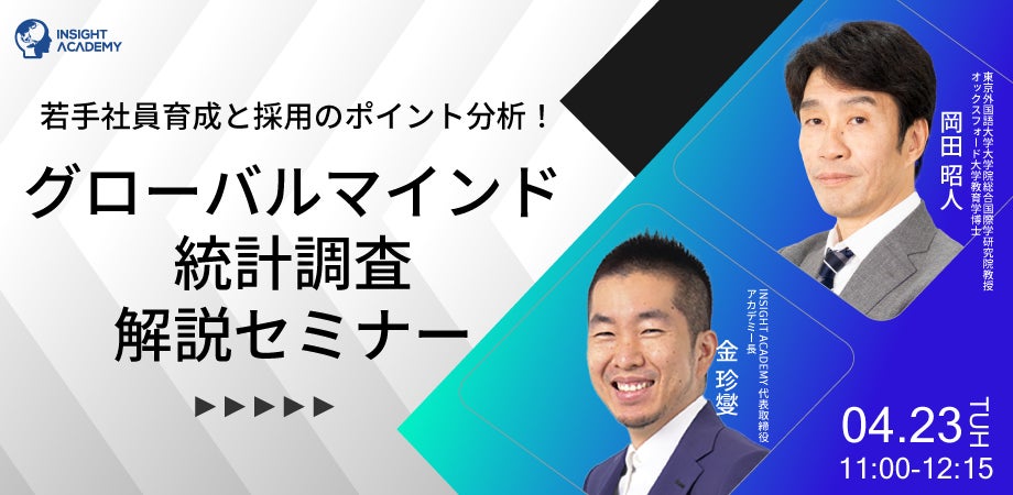 グローバル⼈材育成・研修業を⼿掛けるインサイトアカデミー株式会社(本社:東京都港区新橋、代表:金 珍燮)は、無料webセミナー「若手社員育成と採用のポイント分析!グローバルマインド統計調査解説セミナー」を2024年4月23日(火)11:00より開催します。