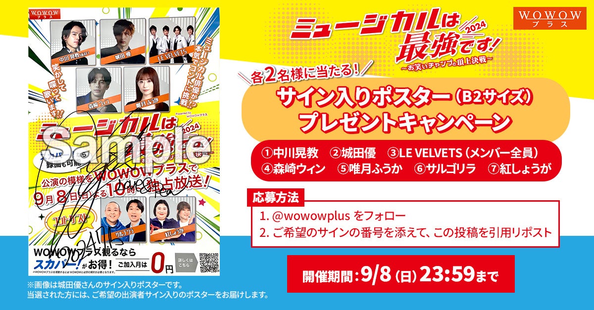 『ミュージカルは最強です!2024 ~お笑いチャンプと頂上決戦~』9/8(日)22時より独占放送!放送を記念して出演者の直筆サイン入りポスターをプレゼント!