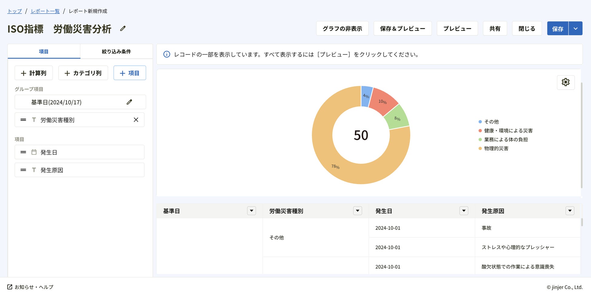 例:ISO指標である「6.健康・安全」の「労働災害」の種別等をジンジャー上で可視化する場合