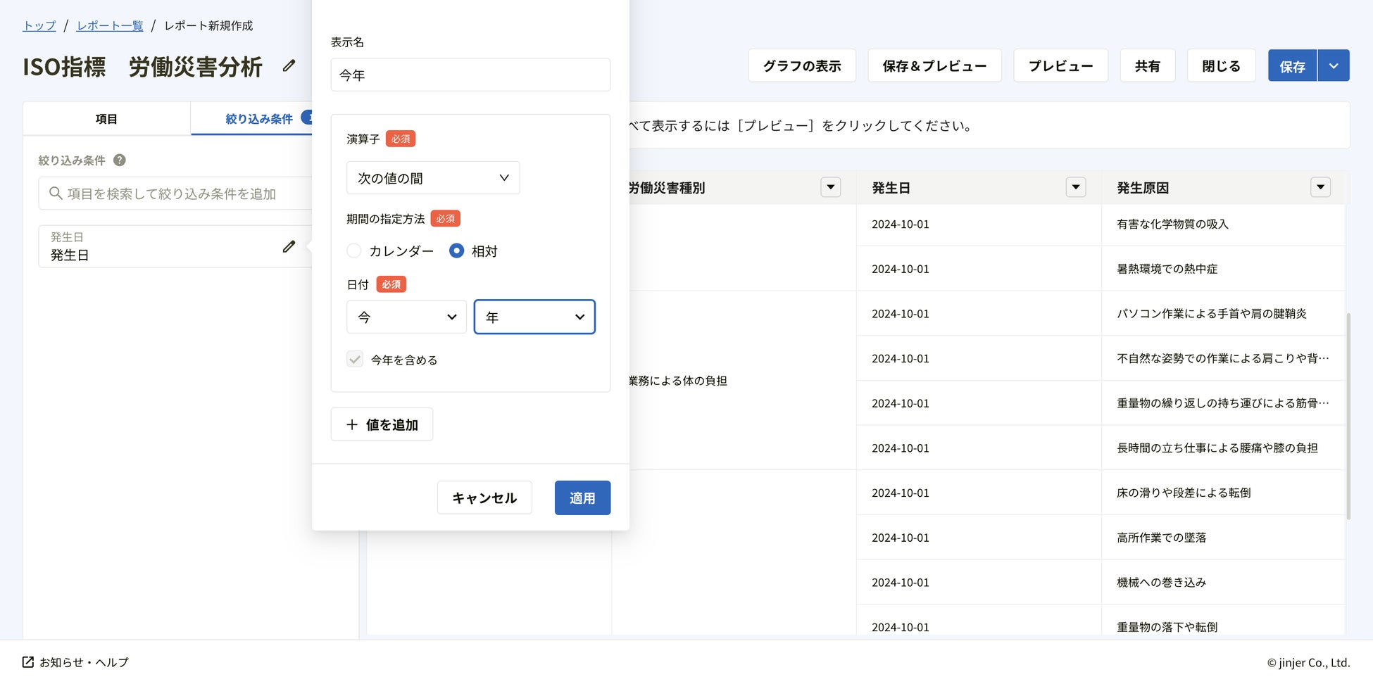 労働災害の発生状況に関して、労働災害の種類に応じて、発生した日付等の条件に絞って、情報を可視化することができます。