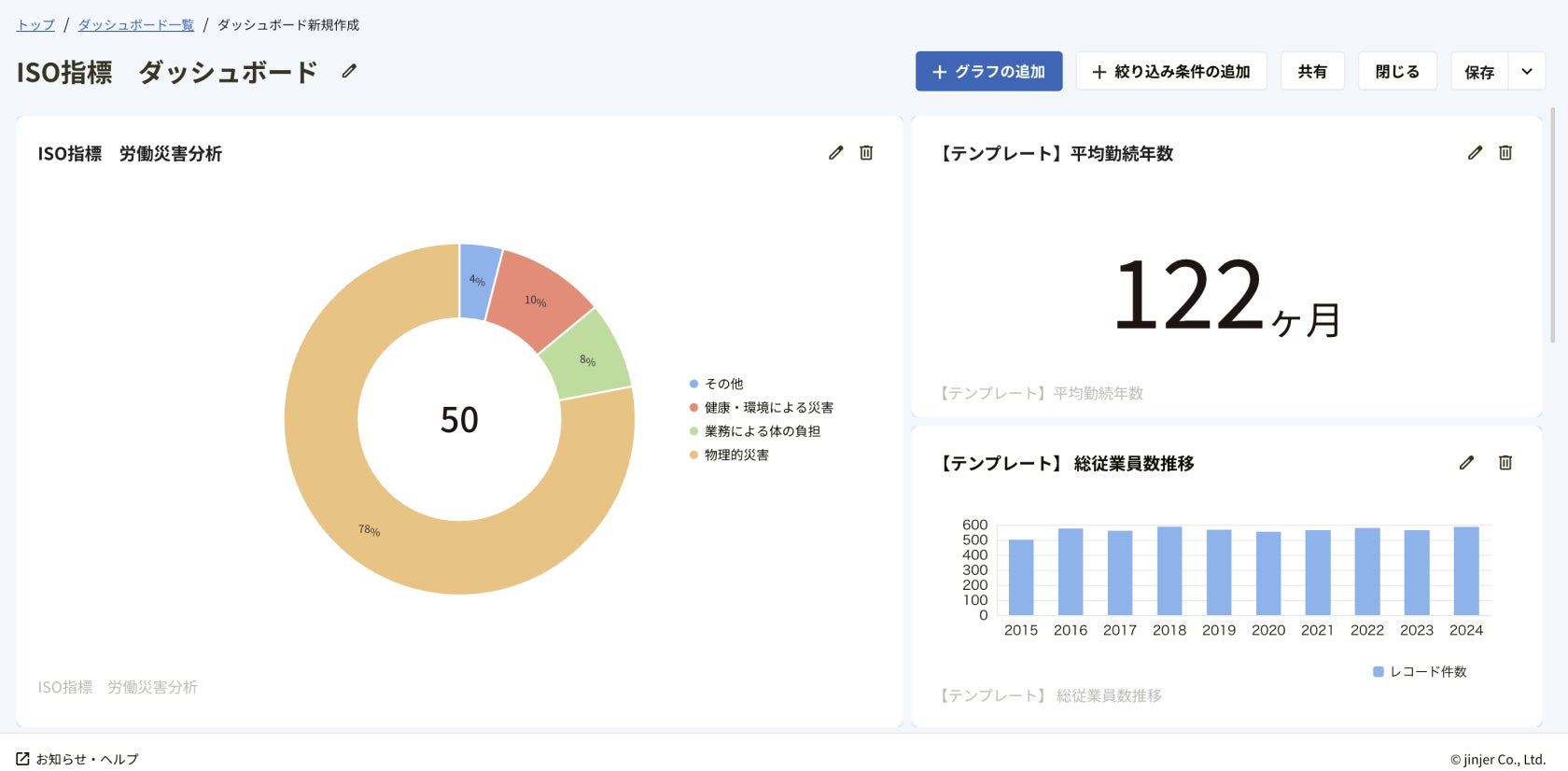 労働災害、平均勤続年数、総従業員数推移等、各企業で可視化したい項目をカスタマイズして、ダッシュボード上に一覧で表示することができます。