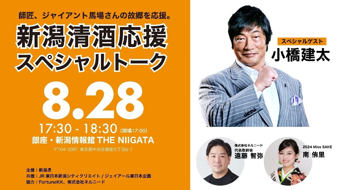 小橋 建太さん(株式会社Fortune KK 代表取締役)をお迎えし、師匠であるジャイアント馬場さんの生誕地、新潟県の日本酒や酒蔵を応援するトークイベントを開催します。