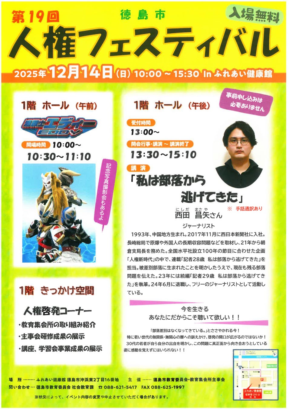 「私は部落から逃げてきた」と題した講演や、人権啓発に関する展示、ご当地ヒーローショーなどを開催します。
