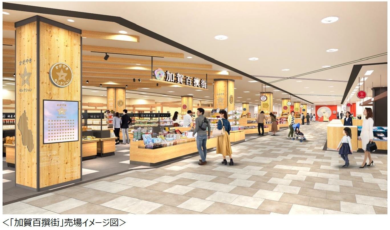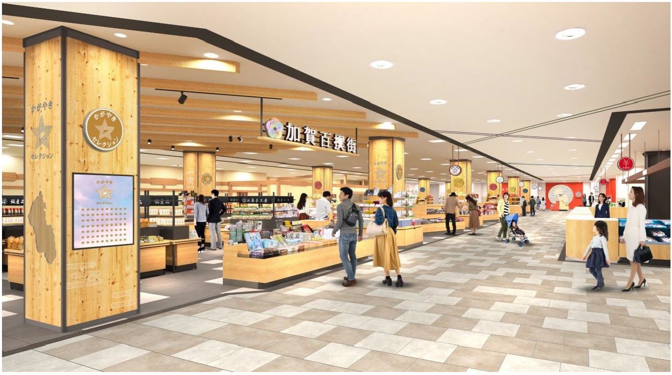 アル・プラザ加賀は、JR加賀温泉駅に隣接するショッピングセンター「アビオシティ加賀」(石川県加賀市)の核テナントとして1997年3月にオープンして以来、多くの地元のお客様と観光客の皆様にご来店いただいています。当店は加賀温泉郷の玄関口にあることから、平和堂の店舗で唯一、土産物店「加賀百撰街」をかまえ、加賀市内最大の土産物店として、長年全国の皆様にご利用いただいてきました。北陸新幹線の延伸により、これまで以上に加賀を訪れる人が増えることが予想されることから、モノの販売だけではなく、居心地の良い環境や体験コーナーでのコト消費のご提供、また開店時間の前倒しなど、より多くの方に満足いただくため、設備面・運営面を含めた加賀百撰街の全面リニューアルを実施します。