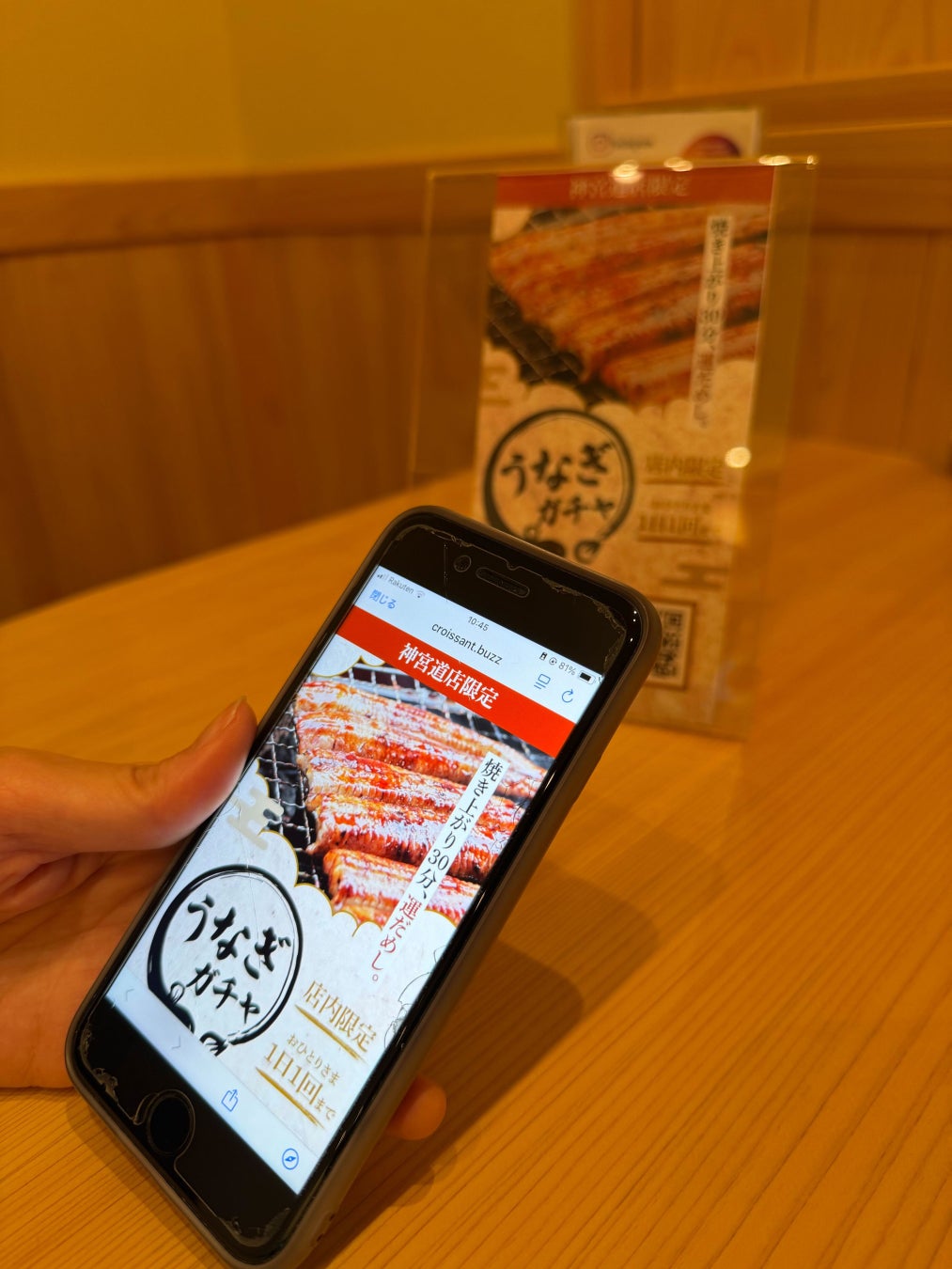 京都・東山エリアに店舗を構えるうなぎ料理専門店「京うな和 本店 神宮道」では、焼き上がりまで約30分を要する「待ち時間」に着目し、卓上QRから参加できる店内限定オンラインガチャをクロワッサンで構築。