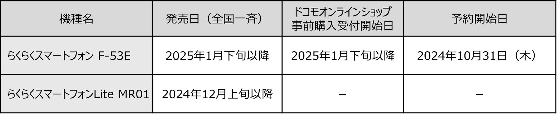 株式会社NTTドコモ(以下、ドコモ)は、らくらくタッチパネル対応のディスプレイと光学手ブレ補正付き5030万画素カメラを搭載した「らくらくスマートフォン F-53E」を2025年1月下旬以降に発売いたします。また、大画面で使いやすく、電池長持ちと長寿命を実現する大容量バッテリーを搭載した「らくらくスマートフォンLite MR01」(SIMフリーモデル)を2024年12月上旬以降に発売いたします。