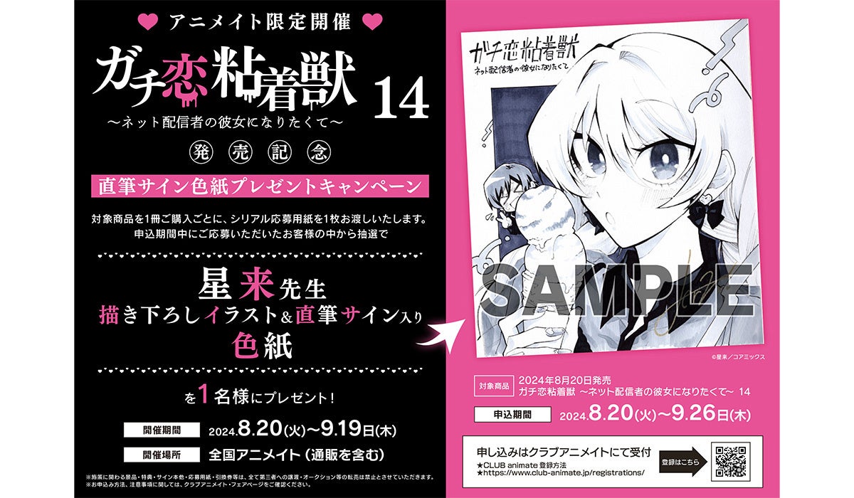 『ガチ恋粘着獣 〜ネット配信者の彼女になりたくて〜』(星来)の第14巻をお買い上げの方に星来描き下ろしイラスト&直筆サイン入り色紙が1名様に当たるキャンペーンを全国アニメイト(通販を含む)で開催いたします。