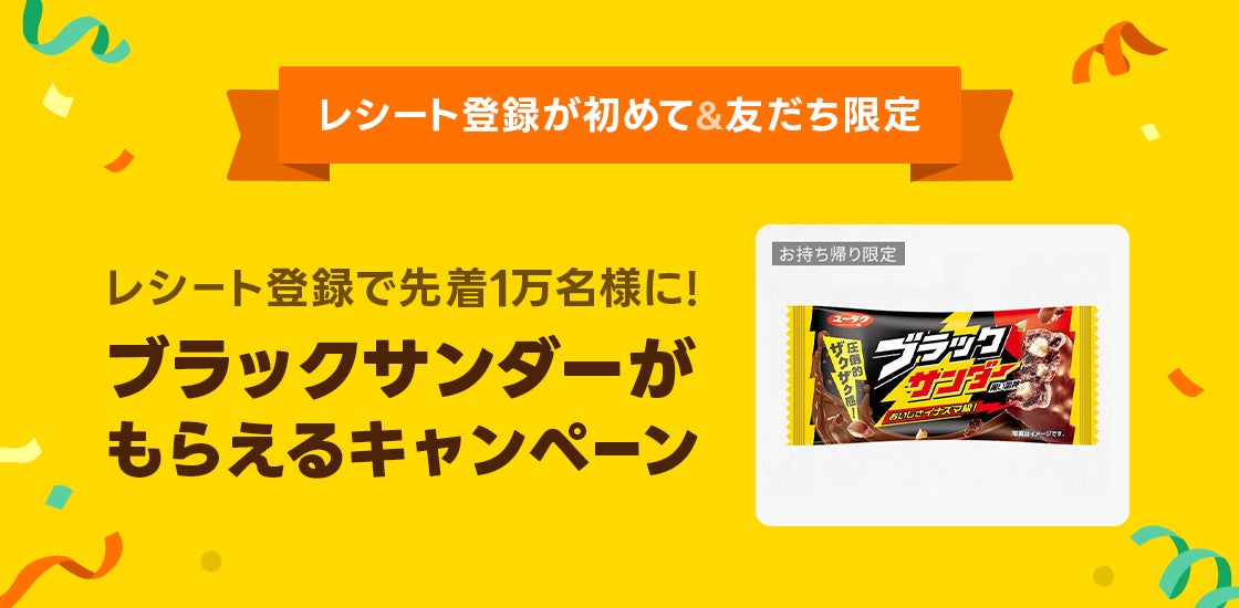 「LINEレシート」のLINE公式アカウントを友だち追加済みでまだレシート登録をしていないユーザーを対象に、対象レシートを1枚以上登録したユーザー先着10,000名様に「【お持ち帰り限定】有楽 ブラックサンダー」をプレゼントします。
