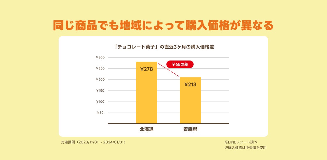 「LINEレシート」に登録されたレシート情報から、今回は人気のあるチョコレート菓子を例に全国の購入価格差をみてみると65円の差がありました。