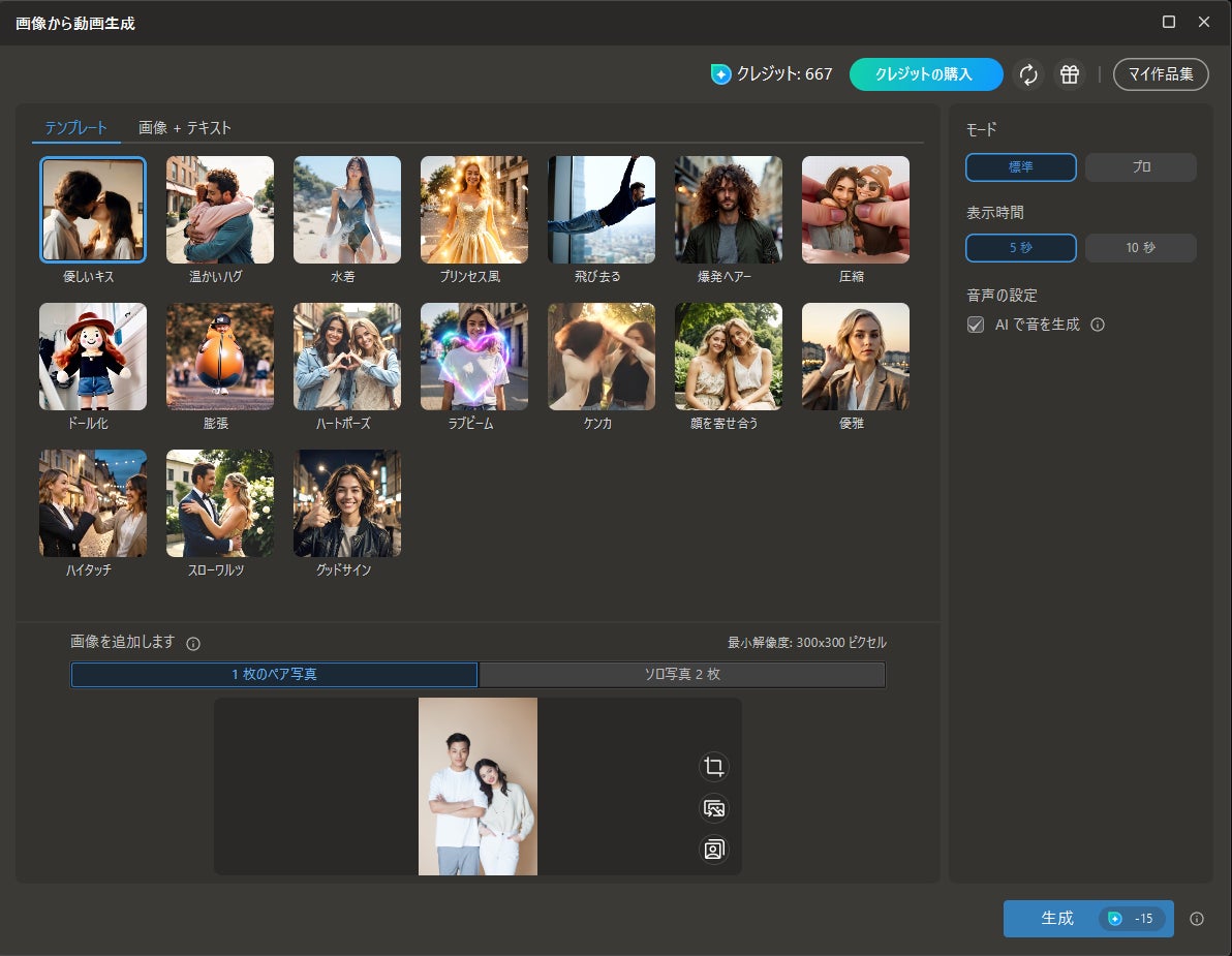 上記の「画像から動画生成」機能と「生成 AI を使用したオブジェクト除去」機能のご利用にはクレジットが必要です。