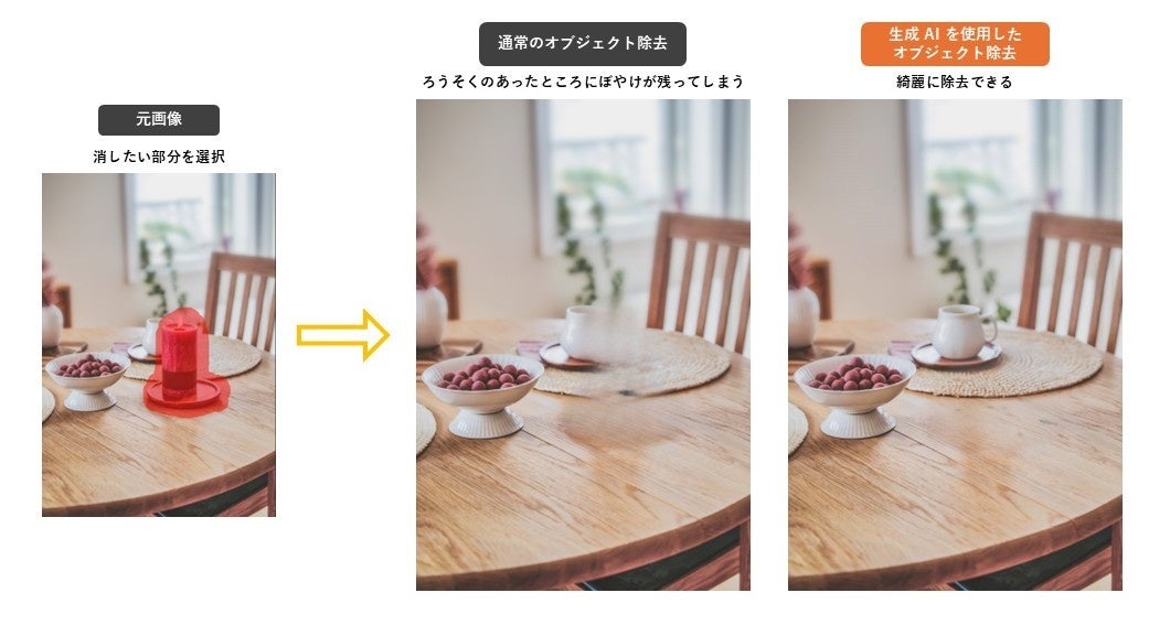 オブジェクト除去機能は、写真や画像に写り込んでしまった不要な人物や物体を簡単に削除できる機能です。今回のアップデートでは、この機能に生成 AI を活用したオブジェクト除去モードを新たに追加。周囲の背景が複雑な場合でも、より自然で高品質な仕上がりを実現します。