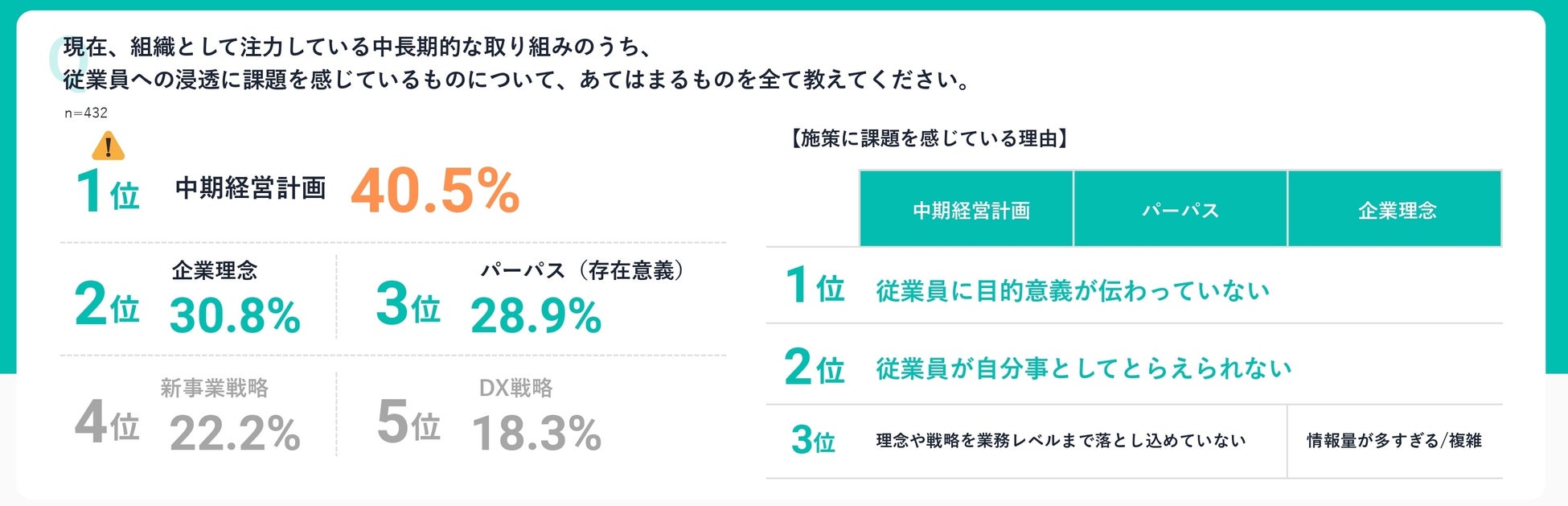 浸透に課題を感じている施策として 「中期経営計画」「理念・パーパス」「新事業戦略」などが上位に挙げられました。