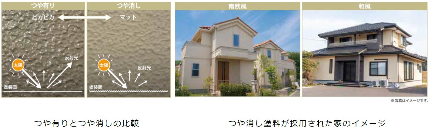 従来、外壁の塗り替えにはピカピカとした光沢感ある「つや有り塗料」が多く選ばれてきました。一方、近年ではマットで落ち着いたナチュラルな質感のつや消し外装材の要望が増えるなど、お客様のニーズが多様化してきたこともあり、「パーフェクトトゥルーマット」を発売いたしました。落ち着いたマットな質感で、上品な雰囲気を演出できます。更に水性塗料として環境や作業者の負荷低減にもつながります。