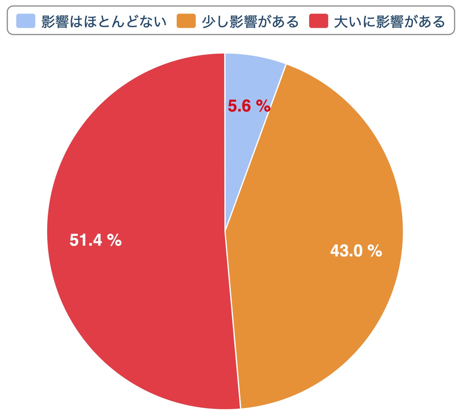 最近の物価上昇が家庭の費用に大きく影響していることが、アンケート結果から明らかになりました。全体の94.4%が物価上昇による費用の影響を感じており、うち51.4%が「大いに影響がある」と回答しました。これは、家計へのプレッシャーが増し、家庭の生活費や消費行動に変化が生じていることを示しています。