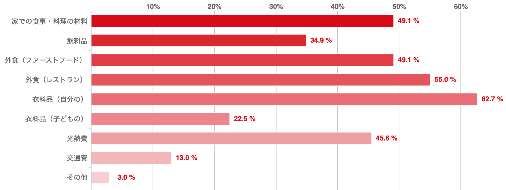 その他、食費においても外食(ファーストフード49.1%、レストラン55%)や家庭内の食事・料理の材料(49.1%)に制限をかけ、家計の負担を軽減していることがわかります。