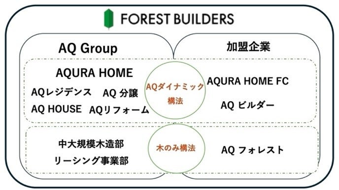 2つの構法に共通するのは高い自由度と可変性、耐震等級3、普及価格帯です。フォレストビルダーズではVC組織として、「AQダイナミック構法」を採用して3階建て以下の木造住宅建築を手掛ける「AQビルダー」と、「木のみ構法」を採用して4階建て以上と低層中規模木造建築を手掛ける「AQフォレスト」があります。「AQビルダー」は「フォレストビルダーズ」発足以降、初期メンバーとして既に12社が加盟。現在でも加盟に関する問い合わせが多数あります。また、今回の第一回総会では中層木造建築を普及していく「AQフォレスト」の本格始動を発表。より一層、木造建築都市(まち)の復興に向けた動きが加速します。