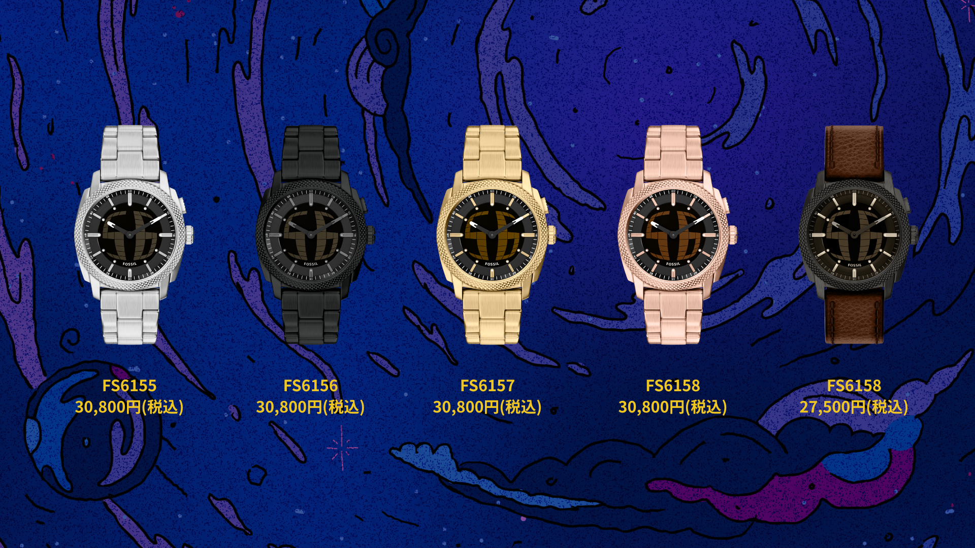 FS6155, FS6156, FS6157, FS6158 (ステンレスブレスレットのモデル) 各30,800円(税込)