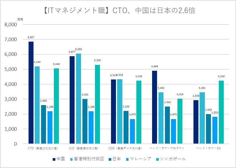 IT業界のマネジメント職では、日本とほかの国・地域との給与差が顕著になっています。CTO(最高技術責任者)では、日本の2,600万円に対し、シンガポール5,048万円、香港5,193万円、中国は6,857万円と、中国は日本の2.6倍。CIO(最高情報責任者)では、日本の3,000万円に対し、シンガポール5,300万円、中国5,877万円、香港6,059万円と、香港が日本の2倍となっています。この要因は、ほかのアジアの国・地域では優秀な人材に高額の給与を出す土壌があり、給与交渉も積極的に行われているためと推察されます。