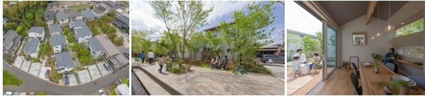 ブルーベリー畑だった土地に、エン(縁)が住民をつなぐ全8棟の分譲住宅。外部空間は、車と住宅のゾーンを分け、南ひな壇の地形を活かして野山のような自然を再現している。家はゆとりをもって点在させ、その余白にコミュニティを育む場として地役権を設定した路と広場を計画。内部空間は、自然や人とのつながりを程よく感じながらも寛げる空間としている。