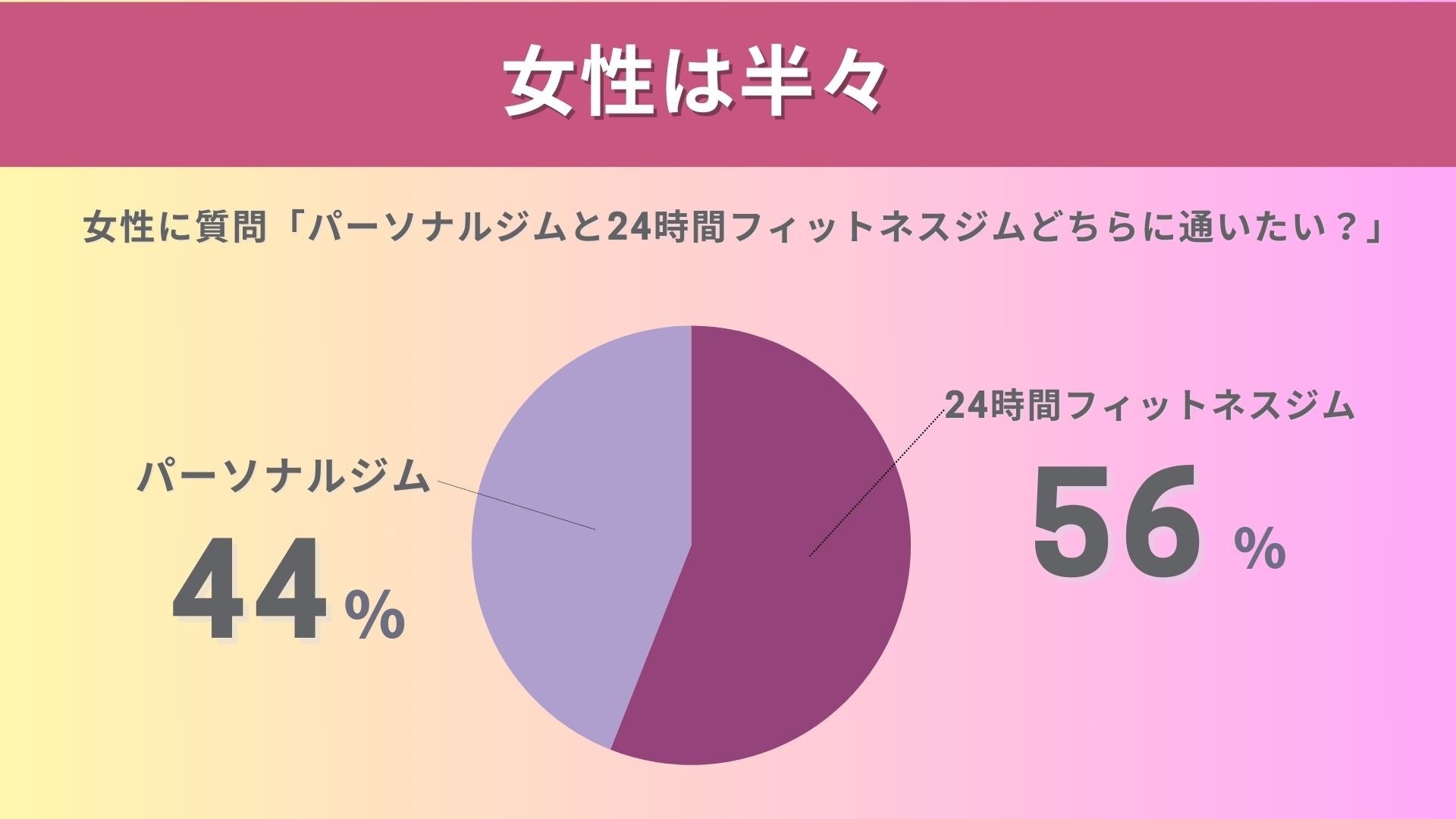 結果として、男性の7割近くが24時間ジムを選択しました。一方、女性はパーソナルジムと24時間ジムの選択がほぼ半々に分かれました。このデータは、男性が柔軟な時間帯で利用できる24時間ジムを好む傾向にある一方、女性はパーソナルジムと24時間ジムのどちらにも魅力を感じていることを示しています。