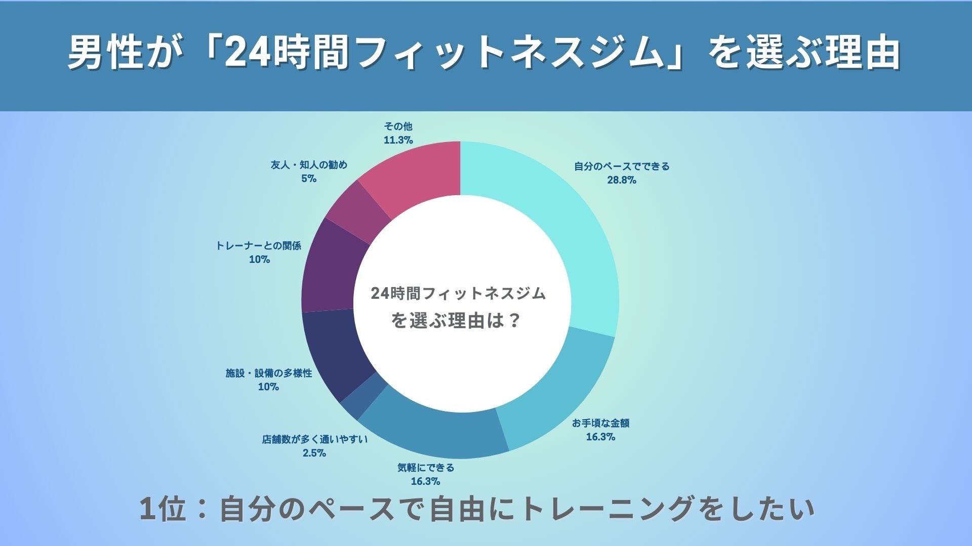 この結果から、男性が24時間ジムを選択する理由として、自分のペースで自由にトレーニングできることが最も重要視されていることが明らかになりました。パーソナルトレーニングよりも個々のライフスタイルに合わせやすく自分で柔軟にトレーニングができるという利点に価値を感じているのではないでしょうか。