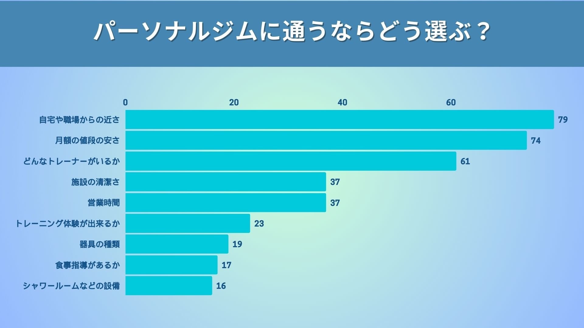 この結果から、パーソナルジムを選ぶ際には「アクセスの良さ」「料金の安さ」「トレーナーの質」が特に重要であることがわかります。