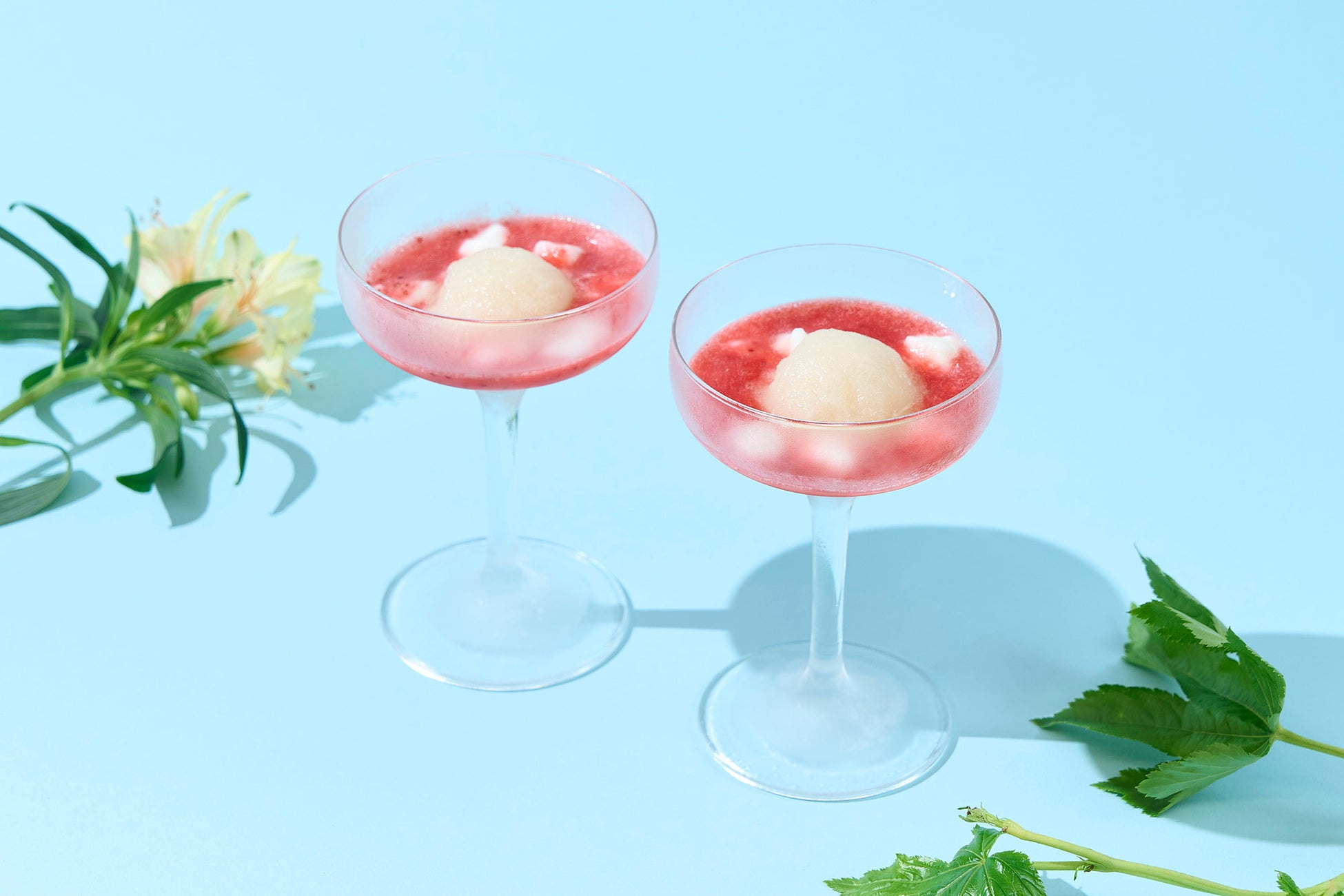 カカオの果肉「カカオパルプ」を使ったソルベに、甘酸っぱく香り高い苺を使ったソース、さらにミルクジュレを合わせました。さっぱりと甘酸っぱい味わいで、お口直しにもぴったりです。
