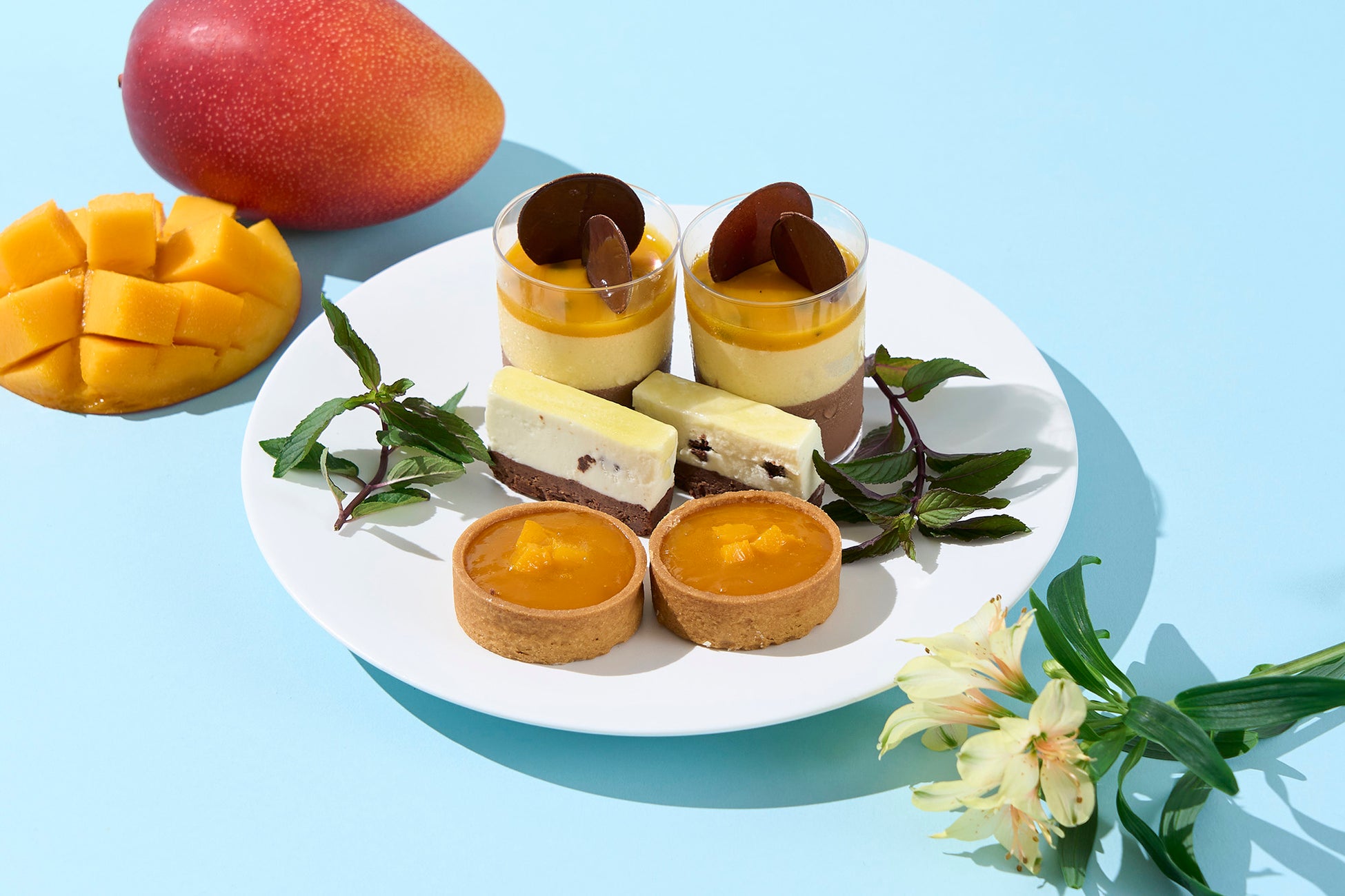 濃厚な甘さの宮崎県産マンゴーの下に、レモングラス焙じ茶を合わせたまろやかな甘味のホワイトチョコレートガナッシュを忍ばせました。マンゴーのジューシーな甘さが、ホワイトチョコレートのなめらかなコクとともに広がり、ほんのりお茶の香ばしさが優しく包み込みます。