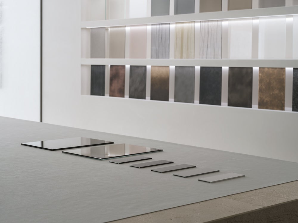 高品質なマテリアルの良さをさらに引き立てるために、照明との相性は大事な要素となります。ギャラリーでは、さまざまな色温度の照明の下で各製品のフレームや面材をご覧いただき、光の透過具合や色みのバランスをご確認いただけます。