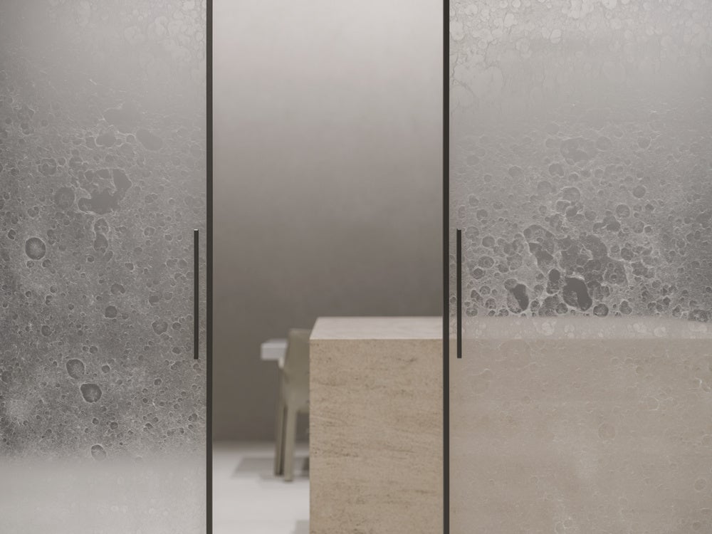 屋内の開放的な空間設計を実現するスライディングドア/パーテーション。日本製最大幅約12m、高さ3mまでフレキシブルに対応でき、ガラス面には和紙・布帛・金属製織物など、さまざまな素材を自在に挟んでカスタマイズすることが可能です。ギャラリーでは、和紙作家の手漉きによる自然な風合いの幅12mmの細フレームが、日本らしい繊細さと美しさを生み出しています。