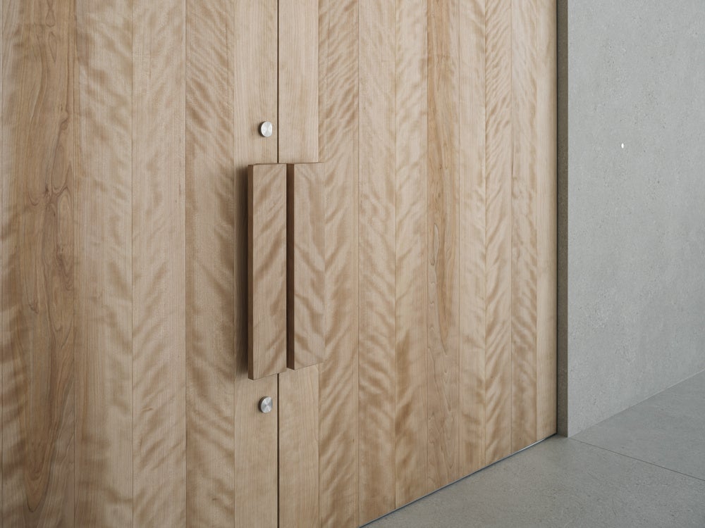断熱性と重厚な趣あるデザインのエントランスドア。高さ3m、幅3mの両開き仕様は、ダイナミック且つ洗練されたエントランスを創出します。当ギャラリーでは天然木ミズメザクラを面材に採用、銘木ならではの美しい風合いが存在感を発揮します。顔認証などによる電動開閉で利便性と安全性を併存させています。