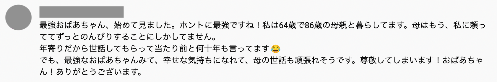 最強ばあちゃん:いつもヘアカットしてくれる人や、毎週家に来るヤクルト屋さんは知ってくれていて、「いつも見てるよ〜!楽しみにしてる」と言ってくれます。