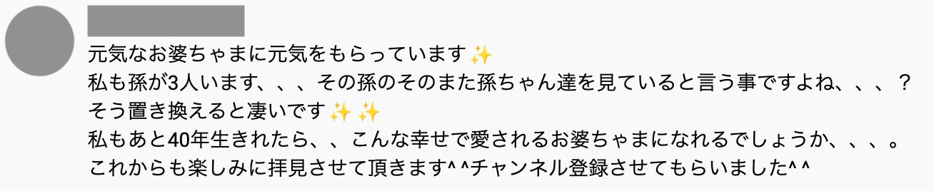 ひ孫:普段なかなか会えない親戚にも、ばあちゃんの様子や玄孫の成長を見てもらえることです。そして、ばあちゃんのYouTubeを見て元気をもらっていると言ってくれる人がいることも嬉しいです。