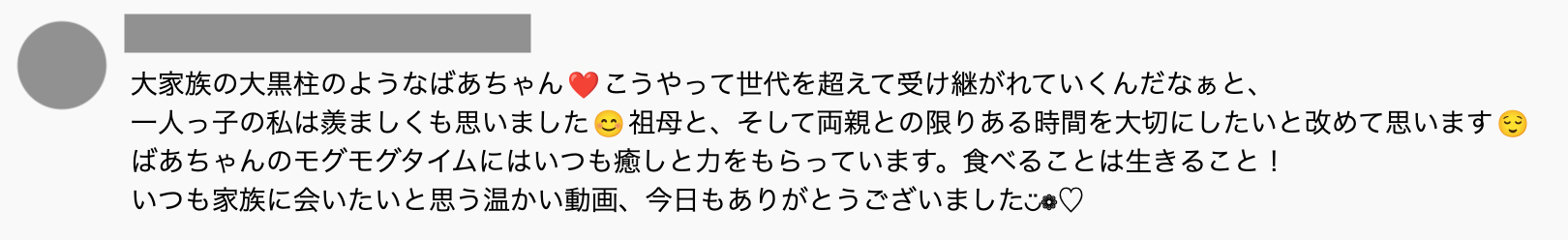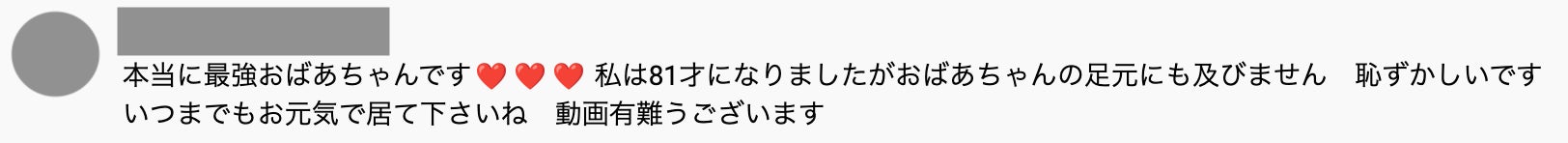 ひ孫:ばあちゃんの姪っ子がしばらくばあちゃんに会っていなかったようで、「元気な様子が見られて嬉しい」と言われました。動画を投稿した日は、家族や親戚にLINEグループで共有していて、「今日も見たよ〜!」とLINEをくれたりします。